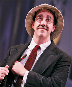 As it merrily mocks social climbers, nouveau riche, phony artists, and scoop-seeking newshounds, this is pure pre-Depression-era escapism. The paltry plot comes with the territory. Besides, it's just an excuse for John Carrafa's invigorating period choreography, clowning director Paul Kalina's inspired sight gags and some wizard Marx Brothers impersonations by Joey Slotnick's born-again Groucho as Captain Spaulding and Jonathan Brody's dead-on Chico as Emmanuel Ravelli. (Unfortunately, Molly Brennan's Harpo is a deadpan downer.) The supporting roles are equally zany, especially Ora Jones as flakily aristocratic Mrs. Rittenhouse (Margaret Dumont in every clueless second) and Ed Kross as two male ingenues, including the fourth brother Zeppo. The wonders are the marvelous and surprisingly elaborate tap-dancing production numbers that erupt from set designer Robin Vest's Long Island pleasure palace. "Watching the Clouds Roll By" is Ziegfeld-flamboyant, while the finale spoofs Versailles as only the Marx Brothers could subvert it. Plus these borrowed or original melodies and rousers like "Three Little Words,""Everyone Says I Love You,""Hello, I Must Be Going,""Hooray for Captain Spaulding," and "Long Island Low Down" really are better than what we put up with today.