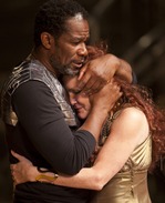 The play, based on the passion of Roman Mark Antony and Cleopatra, queen of Egypt, isn't one of Shakespeare's best, to begin with, so infusing it with some new life isn't a bad idea, but in this rendition a modern look and fast-paced energy aren't enough to hide some other flaws. First, there isn't much chemistry between Kate Mulgrew and John Douglas Thompson who play the lovers, despite the emphasis on sexual tension. They say the lines, and go through the motions of a man and woman driven by passion and lust, but we're not convinced. Neither one of the characters seems all that desirable any way. Thompson, who's earned a well deserved reputation as one of our best interpreters of Shakespeare (as well as O'Neill's The Emperor Jones), is not at his usual riveting best as Antony. He seems confused and lacking in backbone at times, though it's not apparent why. Mulgrew does a nice job of writhing around on her royal chaise in horny anticipation of Antony's return from Rome, jealous, even of the horse on which he sits, but she doesn't look the part of Cleopatra, somehow, and isn't convincing as the mighty queen of the Nile competing for Antony's affections with Octavia (Kenrda Underwood), sister of Octavius Caesar (Scott Parkinson, who also is unconvincing. He's not the forceful emperor you might have in mind). The Roman soldiers' armor resembling Star Trek uniforms only further reminds us of Mulgrew as Captain Janeway (a role she played in the TV spin off Star Trek: Voyager) instead of the mighty Egyptian queen leading her army into war. The battle scenes are nicely choreographed and lighted on the newly refurbished stage which allows for a strip of water down the middle to represent the Nile. The device interrupts the flow of the action, however, as glass covers are removed and repositioned to allow the actors to walk in and across the water which is mopped up during scenes) Modern also clashes with classic and even brings some laughs, not intended, when a stretcher and modern ropes and hardware are used to hoist an injured Antony up on the sharp angled metal set that otherwise effectively evokes images of the ancient pyramids and the blazing desert sun. Yanvich's colorful African-motifed garb for the Egyptians and Cleopatra's attendants Charmian (an engaging Kimberly Hebert Gregory) and Iras (Chivonne Michelle Floyd), along with explosive, drumming music by Linday Jones and Landau's staging of some of the action in the house combine to create a presentation that has striking visual impact. If only looks were everything. Most effective on the interpretation of the content is Landau's discovery of humor in many scenes. Standing out is Jake Green playing a reluctant, fearful messenger delivering some news an angry Cleopatra doesn't want to hear. It's a combination of some things that work well and others that don't, but this rendition, if not the one your mother knew is at least is different.