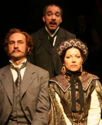 The comedic approach has not escaped director Michael Evan Haney who has five capable actors playing more than thirty roles in the globe-trotting yarn, as compactly adapted by Mark Brown. While changing costumes, wigs, accents, genders and nationalities in a flash provide a field day for the actors, the gimmick tends to become the most admirable aspect of this rather undernourished production. The script allows for a few nicely earned laughs, but the pacing tends to lag especially during Act I. Act II is peppier with a monsoon at sea, a speeding train going over a collapsing trestle, an Indian attack, and a sled ride over ice and snow following in quick succession. This is all accomplished with considerably more brio than brilliance. As produced by The Irish Repertory Theater in association with The Cincinnati Playhouse in the Park (where it recently closed the 2007/08 season), . . . 80 Days is a modestly conceived and designed entertainment made more attractive by an array of stunning costumes, the work of David K. Mickelsen. In accordance with the story, Fogg lavishes a wardrobe fit for a princess upon Aouda (Lauren Elise McCord), the Parsi woman he rescues from being sacrificed on a funeral pyre by Thuggee worshipers. This version, which premiered in 2001 at the Utah Shakespearean Festival in 2001, is apparently geared for family audiences whose demands are met with a minimum of stage magic. In tune with the time and locale, there are glints of Victoriana and exotica among the many props and easily adaptable adornments that grace each change of scene from Bombay to Calcutta to Hong Kong to Yokohama to San Francisco etc. Particularly amusing is how an elephant is created by a chair, a table and a steamer trunk covered with a fancy fabric. Even more in tune is the atmospheric musical accompaniment provided by two musicians at the rear of the stage. Director Haney maintains his focus on keeping the action as frenzied as possible, even if it also seems endless in its prescribed perils. This is not to say that Phileas Fogg's madcap bet with his friends at the Reform Club to win £20,000 if he should travel round the world and make it back to the club in 80 days doesn't move with purpose and clarity. The story is a familiar one and the action designed to test the concerted talents of the four men and one woman. Although John Keating flings himself into such diverse characterizations as a Priest, Indian train conductor, and elephant owner, he registers principally as the obsessive Detective Fix, who stays close on the trail of Fogg believing him to be a bank robber. Jay Russell takes on fourteen assignments, including that of a Chinese broker, with aplomb. Evan Zes is assigned only two roles, but his primary one is portraying Fogg's French man-servant Passepartout. His French, not unlike that spoken by the irrepressible Inspector Clouzot, can best be described as ersatz ("We smoka da piss pipe"). The exception to the multiple role playing is Daniel Stewart who steadfastly remains the independently wealthy, stiff-necked, persnickety and resolute Phileas Fogg who ultimately and unwittingly succumbs to romance. It's a persuasive performance. It is virtually impossible not to think of the recent more convulsively funny version of Hitchcock's The Thirty Nine Steps that uses four actors to play many more characters. Perhaps Haney's direction of . . . 80 Days isn't as imaginative as it could be or perhaps Brown's adaptation isn't as witty or as cleverly inspired as it might be. Just as Fogg's goal is to arrive back home in 80 days, you may consider how lucky you are if your trip home takes you less than an hour.