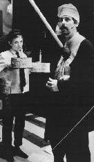 Richard Foreman's take on Nietzsche (Gary Wilmes) focuses, in his typical kaleidoscopic style, on what may be deemed the two pivotal personal experiences of Nietzsche's life: his unfulfilled love for a Russian woman with whom he had an engaging but platonic relationship, here called The Beautiful Woman (Juliana Francis), and his reaction to seeing a horse beaten in the street by a coachman, denominated The Cruel Man (Kevin Hurley). Both of these no doubt fueled the (probably syphilis-induced) insanity that consumed the last decade of his existence. Foreman's plays always give the feeling of being verbal (as well as visual and sonic) collages. In Bad Boy Nietzsche, he offsets his own often-lyrical language with the random words of a deteriorating Nietzsche ("doodles on the margin of his philosophy"): Word shards fill the visual landscape and, as cued, chalk scribbles, easily erased, abound.I write on table, write on wall When I reviewed Foreman's last effort, Paradise Hotel, I made reference to his "signature dream-tableau style, in which primary process thinking finds a rather direct path to the stage.".We find much of this again here, and although Nietzsche's "process" has developed a definite impairment, there's hardly a clearer means of assaying his essence. Do not, however, expect either lucid exposition or fresh observations. Instead, you will find something of an existential nightmare, Foreman-style, in which even the pure voice of The Child (Sarah Louise Lilley) seems to have been processed through the mental equivalent of a funhouse mirror. Voices here, which would be easily heard without amplification, are rendered through Rent-style head mikes that have much the same distancing effect as Foreman's familiar use of clear plastic sheets to separate the audience from the very proximate stage. It's as if Foreman were begging us to do precisely what we must do to appreciate his work: take a step back and engage the cacophony of images and sounds -- blinking, sometimes blinding lights, buzzing bells and all -- not through a microscope that will focus on elements, but through a telescope that lets us observe the whole. It's only through this means that one could possibly hope to compress not only Nietzsche's life and life's work, but what follows in its wake, into this frantic seventy minutes of theater. Trying to describe the sensory assault Foreman and his performers hurl at the audience is, ultimately, pointless. Those familiar with his work will find much what they expect; novices, some of whom will become fans and some of whom will not, are assured a rich, funny experience the thoughtful significance of which may not occur to them until it is over. I've never gone to see one of Richard Foreman's annual shows more than once, but I've always felt I would need to. Such is its nature. The assembled cast of four is excellent and, as always seems to be the case with Foreman's shows, fearless. Wilmes, who returns from a memorable performance in Paradise Hotel last year, embodies Nietzsche's combination of lunacy and anxiety splendidly. Also returning is Francis, who brings a carnivalesque nature and a dazzling faux-Eastern European accent to The Beautiful Woman. Lilley, new to this craziness, has no trouble joining in, nor does Hurley, who enages and alienates by delivering his lines in a voice that often conjures up a cheap television police show. Chaining Nietzsche to the wall of Foreman's imagination may not stop the spinning, but it should at least reverse its direction. LINK TO REVIEW MENTIONED ABOVE CurtainUp's review of Paradise Hotel