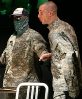 The play also fits the sub-genre of buddy road trip, in this case a pretty surreal journey that takes these men from a military hospital in Germany, across America and to the Crawford, Texas ranch of their Commander-in-Chief. The subtitle, A Fever Dream in Six Scenes, is more than apt. Marshall-Green and Corey Stoll give potent performances as the two maimed veterans and their journey is imaginatively and quite cinematically choreographed by Jo Bonney (strongly supported by composer/sound designer David Van Tieghem video designer Tal Yarden's projected images). There's quite a bit of physical pain and blood for Cato but not for Voychevsky (I won't be a spoiler with too much detail). As for this being a comedy, it's hard to laugh about the tragic loss of lives, limbs, and the nation's honor. Damaged as they are, both men remain committed patriots and the American flag is a visual leitmotif throughout. They're angry, not because they were put in harm's way and suffered truly awful consequences, but because they feel their sacrifice has gone unappreciated. And the playwright uses their wild journey to vent his own angry reaction to the fallout of the mismanagement of our this war and the Afghanistan war which New York Times long-time Mideast reporter Dexter Filkins has dubbed The Forever War (recently published by Alfred A. Knopf). And so, each stop on Cato and Voych's journey from that hospital storage room to the Texas ranch where George W. Bush spent approximately 400 days of his presidency, is a chillingly absurdist look at the cultural climate created by this " forever" war. The other five cast members each play at least two characters and do so very well indeed. On the men's first stop in America, we meet Captain Adler (Dan Butler) whose red shoes obviously symbolize the war's blood money profiteering and Victor Leung (Raul Aranas) whose pimping business is thriving courtesy of two blind prostitutes (Lisa Joyce and Eileen Rivera) — perfect for easing self-conscious disabled men back into sexual activity. In keeping with the play's darkness, Adler's blood-red shoes end up on the feet of one of the traveling buddies' feet. What Voych wants most of course is to go home. Sadly, Thomas Wolfe's oft quote title, You Can't Go Home Again, turns out to have a devastating new meaning when it comes to Voychevsky's going home to his wife Bonnie-Anne (one of Lisa Joyce's three roles) and the baby he never saw. The dark glasses Bonnie-Anne wears even in her living room instantly signal that she's as much under siege inside her home, as her husband was in Iraq. It's after we see the men at Mount Rushmore National Park where the faces of Washington, Jefferson, Theodore Roosevelt and Lincoln are seen upstage and smartly animated by puppet designer Bob Flanagan, that Beast veers into an ever more bizarre direction. It turns out that the Evangelical Christian (Jeremy Bobb who gives them a ride is going to Texas and not, as they thought, Alaska (Bobb's line "Alaska is a shithole. . .No one goes to Alaska on purpose" got a huge unintended laugh courtesy of that state's suddenly high profile Governor). From there it's on to another living room, this time at the Crawford Ranch of G.W. (Dan Butler again). G.W. is polite enough to the unanticipated intruders and initially this meeting plays like a Saturday night skit. But with the Mount Rushmore images still fresh in their minds, his visitors come up with a way to bring their fevered dream to a darkly purposeful conclusion. While Weller leaves the audience — the usual choir who attend and applaud anti-Iraq War, anti-Bush and Company plays— with something to gleefully laugh about, the reality of America since 9/11 and under the stewardship of this administration, has taken on aura as surreal as any fictional drama, a sci-fi saga that strikes many as no less over the top than Beast —and, sad to say, not a fevered dream that can be contained in five scenes but a very real forever tragedy. This is not the only Weller play premiering Off-Broadway this fall season. His Fifty Words, a two-hander starring Norbert Leo Butz and Elizabeth Marvel and directed by Austin Pendleton is currently in previews at MCC Theatre. Other Michael Weller Plays reviewed at Curtainup: Buying Time Heart of Art Split What the Night is For