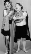 Set and costume designers, Edward T. Gianfrancesco and Basil DuMaurier have furnished the Park Avenue apartment of the audition's absent hosts Dr. and Mrs. Lipcombs, (they are visible via an Andy Warhol silk screen portrait) with enough hilariously convertible props to whiz us through the Big Bang's journey through the whole spectrum of western civilization. The performers also use themselves as props, as when a hand turns into the Serpent tempting Eve with the apple (a Granny Smith, naturally!). The charm and magic of Graham and Feuer's whirlwind musical journey is that their magician-like quick changes are made in full view of the audience and with ingeniously simple materials: a hassock becomes a stone slaves must haul to build the Pyramid. . . a lampshade and scarf create a groovin' Queen Nerfertitis. . . two open umbrellas turn a piece of fabric into a hoop skirt. . . two chairs metamorphose into canoes. . . a black laquered mantelpiece clock with gold trim becomes Napoleon's tri-cornered hat. . . two bundles of yarn with knitting needles turn our two guys into Shanghai Lil and Tokyo Rose. What's more they never try to really hide their rather unassuming appearance. Graham remains visibly bald even as a hoop-skirted Southern Belle with bunches of curls made of bunches of colored ribbons. Feuer's hairy chest is part of the "sex appeal" of the Empress Josephine. The performing impresarios' voices are as unimposing as their appearance but then this is a backer's audition and you, the backer, are expected to imagine what the catchy tunes and witty melodies would sound like when done by Big Bang-worthy singers. Even with Graham and Feuer doing all the honors it's clear that they've written themselves a book in which every other word and name entails a playful innuendo (Julius Caesar's wife Hypernia has a sister named Hernia, the Indians "dumped without any reservations" sip Manhattans at the Alogonquin Hotel and decide to "scalp" their Bow Wow tickets and Yiddishisms lurk everywhere) and score and lyrics with plenty of bounce. As is to be expected, not every number can hit home like the Blessed Virgin Mary and Mrs. Ghandi exchanging the travails of famous mothers (To Mary's "it's not all loaves and fishes/guess who gets to do all the dishes" Mama Ghandi retorts "my son is still in diapers""). A songs about a lion and Attila the Hun are two misses that fell flat amid the hits. Fast on the delivery as both men are, the hour and a half allotted to them is up by the time their story gets to the 1960s, they know it's time to make their final pitch. And so a flyer urging everyone to "invest now!" is distributed by Graham. I think it's safe to say you won't go wrong investing 90 minutes of your time in this modest little show