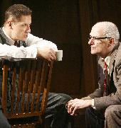 With each man given a few words to establish their respective backgrounds, Bill W. is seen as earnestly zealous. Dr. Bob is defined by his quick-witted honesty ("I was forced by Mother to attend church four times a week. I vowed that when I was free, I’d never darken the doors of a church again – a vow I’ve kept, religiously, for forty odd years"). Robert Krakovski (Bill Wilson) and Patrick Husted (Dr. Bob) portray the two dynamic and dedicated men who, in the midst of their battle with acute and debilitating alcoholism, formed a formidable and historic alliance to help others combat the same addiction. Stephen Bergman, a novelist and playwright, and Janet Surrey, a clinical psychiatrist and author, have collaborated on a courageously blunt, uncompromisingly straight-forward docu-drama that chronicles the circuitous path that these men took to arrive at a practical method of dealing with a life-threatening condition. The result was Alcoholics Anonymous, the organization that continues to save the lives of millions of men and women. Until mid-way into the 20th century, alcoholism was not considered a disease but rather a weakness of character. The first half of the play takes us from 1925 to 1955 and to many locations with dramatic episodes (some catastrophic) revealing each man’s battle with alcohol its effect on their professions, marriage and family life. Yes, this is a message play, but the message is engrossingly deployed within the frame of some terse, often humorously embroidered scenes that include a number of significant supporting characters— notably Bill’s wife Lois (Rachel Harker) and Dr. Bob’s wife Anne (Kathleen Boyle). There are two additional actors, Marc Carver and Deanna Dunmyer, as various men and women who are approached and subsequently helped by Bob and Bill working as a team. Most fascinating are the profound differences in Bill and Bob’s personalities and backgrounds. When we meet Bill, he is something of a dynamo, a Wall Street broker riding the highs and lows with reckless abandon; t hat is until the crash of 1929, when he is wiped out and unable to recoup or find a job. Fanatical in his desire "to be number one", Bill’s fall is as rapid as it is self-perpetuating. Krakovski presents a very honest and sad account of a man who, unable to be the provider, resorts to whoring and brawling. Dr. Bob, on the other hand, is not only a secret drinker, but a surgeon who, when not drinking, turns into "a monster" and can’t function As Dr. Bob, Husted offers a portrait of a man embittered by his inability to cope and consumed by rage. His Dr. Bob is in turn terrifying and pathetic. Aware of his physical disintegration, the violent pains in his abdomen, and the increasingly catatonic fits that alarm his steadfastly supportive but gradually wearying wife, Dr. Bob is, at first, the more cynical and reluctant of the pair to envision a new approach. As Bill’s wife Lois, Harker is exceedingly attractive, and her unwavering but very fine performance helps us see her as a proud and ultimately empowered team player. As Bob’s wife Anne, Doyle’s performance is much more poignant to observe, as her emotional reserves are put to the test, time after time. Among other well-defined characters, Dunmyer is especially good portraying Henrietta Sieberling, an Akron, Ohio matron cum sincere religious spiritualist, head of the Oxford Group House. Of Carver’s assorted characters, his most vivid is of a pathetic despairing lawyer drying out in a hospital bed who finds that resisting the attention and the good intentions of Bob and Bill is futile. It is Bill’s revolutionary vision that the answer lies not in prayer, the most prevalent methodology at the time, but in getting drunks to talk to each other. The breakthrough occurs when Bill, after months of sobriety, finds himself at a bar. Instead of succumbing, he desperately initiates a meeting with Dr. Bob on May 12, 1935 which results in a 6-hour one on one in the lobby of the Mayflower Hotel in Akron, Ohio—historically speaking, the first AA meeting. It's a scene that amusingly shows the two men bait and befriend each other, but unites the key provocateurs on stage for the balance of the play. While both men express their disdain for religion and their doubts about the benefits of spiritual guidance, their crusade for converts nevertheless takes on a decidedly religious aspect. However, that prayer ultimately became a part of AA’s Christian-based philosophy is only alluded to during the epilogue. Under Rick Lombardo’s brisk and brawny direction, Bill W. and Dr. Bob moves along its predictable course with a surprisingly bright energy. Adding considerably to the volatile moods and fully visible at center stage is the piano playing by composer Ray Kennedy, who supplies a good dose of melodic underscoring and a medley of hit tunes from the era. Set designer Anita Fuchs provides an environment of slightly tilted wooden panels to possibly indicate the skewed vision of the inebriated. Not terribly subtle, but neither is the crisp repartee or the wonderful clash of those two titans of temperance.