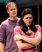 And yet, whether a major and minor league married, Matt and Melora have enough in common to become friends. They are co-workers at a webzine company. He's been there for four years, she's a recent hire, having moved to the company's location when her husband was transferred. Though Newbound never specifies what their jobs are, their initial dialogue establishes that it's a very informal atmosphere which, as it turns out, encourages a lot of casual sleeping around among the never seen other staff members. Unlike their co-workers, neither Matt or Melora are looking for a quickie affair, but both are facing especially meaningful birthdays — 40 for him, 30 for her. These approaching birthdays and the fact that they're both runners, are enough to make even the somewhat reserved Matt receptive to the more outgoing Melora's overtures bo connect. The burgeoning friendship is cemented by frequent meetings in that lunch room. Thanks to this, like most new plays, being a small cast production, that room is always empty and thus encourages the relationship to develop. The big question that Birthday Boy tackles is whether Matt and Melora — or for that matter any a man and woman — can be just friends? Newbound does his best to keep us wondering whether camaraderie will burst into romance over the course of two acts that move from the soon-to-come birthdays to the day for blowing out the candles. As we get to know them better, we learn that Matt's being nervous about that approaching big Four O is exacerbated by his not being quite on the same wavelength with his wife, especially her dream of moving to Vermont. What's more, Melora's marriage has also been stressful (Husband Ron has survived cancer but now both he and Melora are dealing with another tragedy involving his younger brother who was her first boyfriend). Modern marriages are an ever ripe subject for re-examination. However, even the expansion two characters for a reading to four for this world premiere have not made Birthday Boy a truly satisfying, dramatic new look at the way people, especially at certain points in their lives deal with boredom, stress and temptation. It's too sketchy and for most of the hour and a half (plus intermission) too static to be a truly satisfying dramedy. While Franklin and Ludwig are attractive and solid actors, the characters they play, especially Ludwig's Matt, simply aren't all that interesting. The audience is likely to take Matt's half joking, self- deprecating remark about being " as boring as a piece of furniture" at face value. Except for a well done fantasy scene that evokes the temptation that gives this a touch of will-they-won't-they suspense and the scenes that bring Arianne (Keira Naughton making the most of her secondary role) into the picture, there's no really dramatic high point. The fourth character, Arianne's infatuated student Julian (Nick Dillenburg), adds a much needed note of comic relief. However, he doesn't really add anything to the basic conflict and makes one wish the playwright could have added another character to perhaps represent Matt and Melora's work colleagues and fill us in a bit more about just what everyone does in this office. The production is handsomely staged, almost too much so. Striking as Kenneth Grady Barker's scenic design is, a less complex setting would have worked just as well (probably, better). If Barker had designed the lunchroom kitchen area on rollers to swivel around for the scenes in Arianne's bedroom, there would have been no need for stage hands to frequently interrupt the story to move props on and off stage. BTF CEO Kate Maguire is to be commended for bringing new works to the theaters under her stewardship. Even though Birthday Boy isn't on a par with last year's end of season In the Wake, it's nice to see the Berkshire theater season extended by BTF as well as this area's other companies. Birthday Boy closes September 3rd but will be back at the end of the month for another few weeks. Production Notes ) Birthday Boy by Chris Newbound World Premiere-- part of BTF's Made in the Berkshires festival Directed by Wes Grantom Cast: Nick Dillenburg (Julian), Tara Franklin (Melinda), James Ludwig (Matt), Keira Naughton (Arianne) Scenic Designer: Kennet Grady Barker Lighting: Derek Wright Costumes: Charles Schoonmaker Sound: Phil Pickens Stage Manager: Kyle S. Urquhart August 30th to September 3. (and reopening September 29th to October 16th Reviewed by Elyse Sommer at 8/31 press opening |