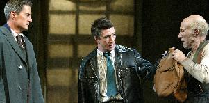 So be it then if comedy has the upper hand in the Roundabout Theatre's current revival starring Patrick Stewart as Davies, Aidan Gillen as Mick and Kyle MacLachlan as Aston (twenty years after its 1982 production which featured F. Murray Abraham, Daniel Gerroll and Anthony Heald and forty-two years after the play's Broadway premiere with Donald Pleasance, Alan Bates and Robert Shaw). So be it also that The Caretaker's stage and screen offspring have dulled its postmodernist edginess as a beginning-middle-end tradition breaker with unreliably ambiguous characters, and that Stewart's Davies is more predictably comic loser than menacing outsider. This power struggle in which no one is a caretaker of anything or anyone takes its menacing relevancy from the ever escalating visibility of disoriented, homeless people living in cardboard houses on the streets of our major cities. The plot remains unchanged: Davies, an aging bum is rescued from a fight and given temporary shelter by Aston, a mild-mannered, emotionally shaky eccentric. Though determined to become a steady boarder rather than an overnight guest, Davies sneers at everything Aston offers -- from the dusty bed, to the shoes he badly needs -- and, in what can be seen as a desperate man's last ditch effort at self esteem, disparages the minority residents next door. Aston's younger brother Mick at first attacks the new roommate, then befriends him and, like his brother, offers him a job as the building caretaker which encourages the wily outsider to play up to each and eventually find himself once again on the road to nowhere. The fairly uneventful plot unfolds with all the famous Pinteresque pauses also in place, beginning with an almost excruciatingly endless opening. And Patrick Stewart has succeeded in the aim expressed in an interview with New York Time culture critic Mel Gussow -- to uncover all of the play's humor while investing the crafty survivor with that sense of reaching the ultimate snapping point. Costume designer Jane Greenwood has done much to help him achieve tramp perfect authenticity. To push him to that critical snapping point, Kyle MacLachlan and Aidan Gillen do good work as the pipe-dreaming brothers. The swaggering, volatile Mick's Donald Trump-like ambitions to fix up the shabby tenement they call home is as unrealistic as slow-moving former mental patient Aston's fixation on building himself a work shed; and, while there isn't a sign of sibling feeling at any time, in the end some unspoken blood tie makes them both destroy Davies' own pipe dream of finding a permanent nest. Stewart's digging for humor often elicits not just chuckles, but loud laughter. He's hilarious when he tries on the much needed new pair of shoes Aston offers him and and even funnier when he finally accepts another pair but balks at the idea of brown laces with black shoes. However, the evening's comic highlight is a three-way vaudevillian dance, expertly choreographed by director David Jones, when the three characters joust for possession of what is purportedly a leather bag belonging to Davies. Thanks to John Lee Beatty's ability to apply his well-known gifts for creating detailed upscale interiors to the garbage-dump decor of life's underbelly, the stage is strewn with the symbols of these men's failure to connect to life or each other alluded to in the script: piles of old papers, a rolled-up carpet, a single wooden chair, a clothes horse, a vacuum cleaner and other disparate detritus that reflects the isolation and meaninglessness of its occupants. Beatty has not overlooked the two most symbolic props: a bucket that's suspended from the ceiling, a menacing potential destroyer of any semblance of comfort and serenity, and the junk shop Buddha that's just waiting to get smashed. Peter Kaczorowski lighting and Scott Lehrer's incidental music add to the production's visual strengths. Considering the fact that The Caretaker, at almost half a century of age has reached classic status, a revival like this would benefit from a practice not unusual for three act, two intermission plays -- finding a single breaking point. As it is, two hours and fifty minutes (with the two intermissions) directed at a somewhat too moderate tempo, puts something of a strain on even the most devoted visitor to Pinterland. For a review of the most recent London revival of The Caretaker go here. For our Harold Pinter backgrounder with links to other reviews of his plays go here.
