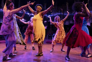 As an alternate title for the work -- or maybe an alternative to the despair of the title's first half -- "when the rainbow is enuf" refers to the quasi-characters who inhabit the world of the play. Now, for colored girls is back at the Public Theater where the piece emerged in 1976 before swiftly transferring to a successful Broadway run. Director Leah C. Gardiner has crafted a production nourished by the affection shown and attention paid across this rainbowed community: seven women, whose dresses (strikingly designed by Toni-Leslie James) are tessellated with the faces of each actress' most cherished female relative, each represent a different hue of the experiences of women of color in this country. (The piece comfortably opens the umbrella to foreground Afro-Latina stories, too.) Gardiner celebrates what comes beyond the title's slash mark with a clarity that ensures we do not miss its meaning: for colored girls remains a choral anthem in honor of the engulfing compassion of a group of women of color who hear each other and transform one another's trauma into art. The light absorbed from the performers and refracted back towards the audience by this shimmering production is the light generated from a community of women who listen -- non-judgmentally, caringly, intently -- to one another. They listen silently, sometimes, from the sidelines, but they are ready to move forward, to support -- physically, in the wake of a gutting retelling that sends the speaker reeling, and emotionally -- when the time comes. But they also sometimes listen with active passion, spinning verses into footsteps as they do so: while one woman tells a tale of triumph or trauma, another woman standing beside her will dance it. Despite the lofty place for colored girls occupies in the theatrical pantheon, and despite the gorgeously mirrored playing space designed in the round by Myung Hee Cho, some of the most special moments are the ones that feel least like a stage performance and most like a communal share or open mic. As the women watch one another, they'll sometimes sip from water bottles or dab their brows with handkerchiefs. At times the lines between character and actor blurs; during one dance break, the Lady in Yellow cheered on the Lady in Blue, calling out, "Go Sasha!" (That's Sasha Allen, a former semi-finalist on The Voice , who stands out both as a singer and monologist here.) And it is as if they are hearing the words for the first heartbreaking time when the Lady in Red (Jayme Lawson) unfurls her harrowing story of unfathomable loss, her tilting voice deepening into a despairing cello in the monologue's final moments. Camille A. Brown, whose phenomenal choreography animated the ensembles of Choir Boy and the Metropolitan Opera's Porgy and Bess earlier this year, turns now to the meticulous sculpting of individual figures in interwoven motion. There's the Lady in Purple (Alexandria Wailes), whose storytelling fluently fuses American Sign Language with improvisatory grace and the Lady in Yellow (Adrienne C. Moore), an exuberant delight, inviting her sisters-in-stories to join with her as a schoolyard chants morphs into an ebullient step routine. And when the Lady in Green dances -- played by Okwui Okpokwasili, recipient of one of last year's MacArthur "genius" grants for her own choreography -- her movement ripples with specificity, strength, and the sense that, as Shange writes, "there is no me but dance." Only when the focus on the cast as ensemble shifts into the background does for colored girls give up some of its gripping ground. Composer Martha Redbone, whose smooth, warm live music (with music direction from Deah Harriott) breathes vital life through much of the show, has set to music one poem, a later work of Shange's added to this iteration of for colored girls , as a thrilling solo feat for Allen. The astonishing vocalist turns the text -- "I could sleep with a man, but I'll lie with the souls of black folks," the poem begins -- into a euphoric, plaintive hymn that's almost overwhelming to hear. But perhaps because Allen is so stirring a singer, I found myself overlooking Shange's words when they appeared in song for a prolonged period as they do here. As much as Shange surely would have urged a celebration of Allen's bounteous gifts, these moments of intensely glorious singing back away from the more immediately interdisciplinary merging of language and movement that characterize most of the piece as originally written. It's hard to re-learn how to listen quietly after hearing that glistening song. But maybe focusing on the story being told in front of you -- not on the one you'd rather be hearing -- is part of the lesson that for colored girls continues to teach. |