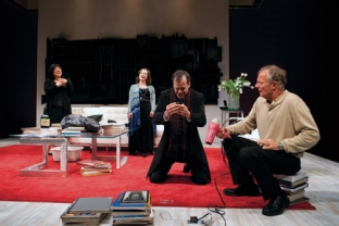 Presumably well served by Christopher Hampton's translation, Reza's comedy bristles for much of its seventy-five minutes with comically caustic dialogue. Much of the fun results from the team work of four excellent actors — Betsy Aidem, James Ludwig, Christopher Curry, Ann Harada — each of whom exhibit an impressive range of behavioral surprises. The play, which takes place in the living room of an up-scale home in Brooklyn's Cobble Hill section, concerns a face-off of two sets of parents, each committed to standing up in support of and in defense of their son's physical confrontation in a school yard. A hot-shot lawyer Alan (Ludwig) and his cool and collected wife Annette (Harada) are paying a presumably civilized call on a successful blue-collar entrepreneur Michael (Curry) and his wife Veronica (Aidem), who collects and writes about art. During the ensuing visit, they each proceed to review the circumstances that led one boy to assault the other. It doesn't take long, however, for tempers to flare and for everyone to lose their composure amid an increasingly ugly battle of words, sometimes hurled at a spouse. The tensions and accusations that are released more often than not peek into specific aspects of the marriages, airing personal and often petty grievances. All cast members have been afforded a marvelous opportunity to make a case that either puts them more directly in harms way or reduces them to being less civilized than their original airs made them seem. Ludwig, who last appeared at George Street in Ctrl+Alt+Delete in 2003 and more recently played Lancelot in the original Broadway company of Monty Python's Spamalot, is terrific as Alan who attempts to stay in control of a business crisis on his cell phone while also addressing the legal angles of the potential law suit at hand. Harada, who originated the role of Christmas Eve in Avenue Q, is always a joy to watch. She is especially so as Annette, a composed executive who, with hilarious results, loses her self control with the help of a bottle of rum and feelings of nausea. Theater veteran Curry is terrific as the initially conciliatory Michael who, when push comes to shove, delivers his own explosive rebuke to the situation. Aidem, who last appeared at George Street in Arthur Laurents' Jolson Sings Again, is seriously funny as Veronica, who, as the instigator of a full-out range of pent-up hostility among the others, decimates and contradicts her own liberal views on proper social behavior. That these four pretentiously civilized people manage to wreck emotional and physical havoc within designer James Youmans's black, white and red living room setting without damaging the impressive pseudo Louise Nevelson wall sculpture, is commendable and a hopeful sign that some boundaries to civilized behavior do exist. Postscript: "A week ago I lost my best friend, " began David Saint in his opening night greeting to the audience. He was speaking about the passing of legendary theater playwright Arthur Laurents, who had been George Street's playwright-in-resident in recent years where many of his last plays premiered. Saint, who was in the midst of rehearsing God of Carnage, talked about visiting Laurents while he was gravely ill. "I want to be there on opening night," Saint recalled Laurents saying. He then raised his outstretched arms and (making an apology for taking a small liberty with a lyric from Gypsy) and with misty eyes spoke out with intensifying feeling, "Arthur, this one's for you. . .for you. . . for you."