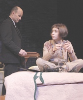 Mick still has big dreams of leaving the Kelly boarding house in a small Georgia town and becoming great by the time she's seventeen. She elaborates on one such dream — to become an inventor — with an amazingly timely idea for a radio "the size of green peas. People could stick 'em in their ears and walk around listenin' to music any time they wanted.". Mostly, however, she wants to become a musician and her prescient idea for that tiny radio is no doubt prompted by her habit of lurking outside the homes of people who tune in to her favorite programs. Like all the characters in this melancholy depression era story, Mick's dreams and desires are crushed. Not so her creator. Carson McCullers, who also grew up in a small Georgia town did make it big as a writer, starting with this her first novel, which was published when she was just twenty-three. It's been a long time since I read . . .Hunter. Unlike William Faulkner, another Southern gothic writer whose work I read about the same time, McCuller's characters and setting always struck me as more universal and accessible and therefore etched themselves more vividly in my memory. Often, while wandering the streets of New York or even at a party, I've been reminded of the rush of isolation evoked by this unforgettably disturbing book. I therefore decided to see Rebecca Gilman's stage adaptation without first re-reading the book or watching the movie version and instead rely on memories from the reading experience to help me judge whether the play lived up to the reading experience and whether it held up on its own for someone seeing it without prior acquaintance with the book . Gilman, who's written a number of strong dramas (Spinning Into Butter, The Glory of Living, Boy Gets Girl, Blue Surge) and herself grew up in the South, obviously had her work cut out for her in trying to make McCuller's novel stageworthy. After all, the book is fairly plotless, but essentially a portrait of a group of doomed to disappointment characters in a small town in the deep and deeply bigoted South at a time when the Great Depression still in full force and the clouds of World War II increasingly visible. The constraints of adapting a book for the stage made streamlining the text and paring down the cast of characters a necessity. The good news is that Ms. Gilman has done both quite ably, and without sacrificing the key characters. The Kelly household is reduced to Mick, her father and a single boarder. The tubercular Dr. Copeland, the town's only black doctor is included, as are two but not all of the children (Portia and Willie) who have ignored his pleas to become educated, upwardly mobile instead of downtrodden Negroes. Biff Brannon, the proprietor of the town's diner and one of the few thoughtful and observant characters is on hand but his wife Alice is mever seem/ The pivot for all the characters is John Singer, the deaf mute who ironically becomes the good listener, a magnet for the confidences of the others' dreams and desires even though no one bothers to learn about his own tragically ended relationship with Antonapoulos, another deaf-mute with whom he lived before moving to the Kelly boarding house. Unfortunately, Gilman's script also doesn't give Singer's relationship with Antonapoulos the attention it warrants and thus fails to convey the darkness and depth of his isolation and final act of desperation. That said, while I didn't see Alan Arkin's much praised portrayal of John Singer in the movie version, I can't think of a more ideal actor to play Singer in this stage version than the unassuming Henry Stram. He's the sort of actor's actor able to slip into all manner of complex roles (to name just a few: Pinter's The Birthday Party, Michael John LaChiusa's unusual musical See What I Wanna to See, Arthur Miller's The Crucible). And he certainly doesn't disappoint here. Director Doug Hughes has drawn strong, sensitive performances out of everyone here. Christin Milioti, not only imbues Mick with convincing rebellious spirit and optimistic bravado (at least for most of the play) but looks remarkably like Carson McCullers. Andrew Weems does well by Jake, the hard-drinking political organizer and James McDaniel and Roslyn Ruff are outstanding as Dr. Copeland and the pious daughter who loves him despite their opposite beliefs. But even with one of our best directors at the helm, Ms. Gilman's script being more than reasonably true to the book, and the outstanding work of the actors, ultimately the ideal way to experience these angry and sad, hopeful and hopeless people and the evocative landscape of the late 30's deep South is to read the book. Set designer Neil Patel has taken advantage of the New York Theater Workshop's wide stage to set up the town's various locations clear across the stage, with some of the individual setting sliding forward and backward as called for. This works quite well, as do Jan Hartley's projections of Mick's and the mad preacher's and Jake's verbal graffiti. Catherine Zuber's costume, Michael Chybowsky's lighting and David Van Tieghem's original music and sound design all support Mr. Hughe's stark but smooth staging. However, it's all a bit distancing. That, plus the necessary streamlining of text and characters, makes it difficult to get quite as viscerally involved as I remember being when I read the book. Despite the fact that this adaptation is overshadowed by its source, the combination of respectful adaptation, excellent acting and skillfull direction and stagecraft add up to a mostly absorbing evening — especially if you're familiar with the book so that your memory will fill in the scenes and poetry that' have gone missing in the page to stage transition. While not being familiar with the book (or the movie) won't prevent you from understanding what's happening on stage, it will probably make you want to read the book and the good news in that case is that, masterpiece that it is, The Heart Is a Lonely Hunter is 