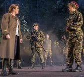 This is the best Brexit play as the English are largely heroic and the French court are shown to be shallow, full of self love, obsessed with fashion and with their horses. The cross gender casting has Michelle Terry as Henry but first we are surprised that the Catholic Church had admitted a woman bishop, Joy Richardson as the Bishop of Ely. The Sallic law is explained to us which denied women's right to inherit thrones but these claims are denied because the Sallic area is in Germany not France. It is through Isabella of France mother to Edward III that Henry V has claims on France. Mountjoy (Jessica Regan) sniggers as she brings the Dauphin's insulting message to the new English king. I had no idea that tennis was such an aged sport as tennis balls are offered to Henry like toys to a child. But Henry rises to the occasion and sends back the message to the French court that cannon balls will be his answer to them. In the French court we are taken with the decorative braid scrolls on the sleeves of modern suits and shirts with all the naf trimmings. So to Harfleur where Henry lays siege to the French town with modern artillery fire as soldiers in modern camouflage engage. The Boy (Ben Wiggins) reveals the bad behavior of some of Henry's army, notably Hal's former Cheapside cronies, Nim, Pistol and Bardolph. After a persuasive speech from him the citizens open the great gate with superb sound from Avgoustos Psillas. "Use mercy," instructs Henry to his soldiers as he tells his army to behave well in victory. Back at the French court, the French Princess Catherine (Ben Wiggins) is learning English from her Nurse Alice (Joy Richardson) in a very saucy way with lots of word play. Wiggins' French accent is excellent. The Dauphin and his courtiers are derisory about the citizens of Harfleur who have surrendered to the English. After the interval, the French prepare for battle by talking about their fashions, they will wear blue camouflage, and with excessive statements about the fineness of their steeds. We are told the history of Henry V's accession to the throne. His father usurped the throne from Richard II but Henry V is blessed with the divine right of kings. The magnificent almost Churchillian speech is made before Agincourt with its references to those who fought on St Crispin's day. The battle is staged not with English longbowmen but with cannon fire and rifles, smoke and lighting coming up through the grid floor. There is the sound of artillery fire and drumming with as much battle atmosphere derived from the blinding back lighting as you could have in an indoor theatre. The battle field is flooded in areas reminding us of the hundred years since the battle of the Somme. The French choose to murder the boys, just children, left alone in the English camp which of course incenses the English. A photo opportunity is staged as Henry and the King of France (David Sibley) sign the peace with the dynastic marriage between Catherine and Henry as a part of the terms. Here Robert Hastie scores a first for me when his tall cross gender princess shows how much she disapproves of the arranged marriage. Looking at the difference in height and the expression on the tall princess's face, we know this is not a happy pairing. Robert Hastie's production is highly watchable and creative. The performance from Michelle Terry grows in statesmanship and wisdom in the play, and the ensemble cast has not a weak player. Charlotte Cornwell's Chorus narrates with great clarity. The postscript is that after the King of France makes Henry his heir. Henry dies at 36 some month and a half before the French king, leaving a baby Henry VI as the new king of England and France. Joan of Arc helps the dauphin to the French throne leaving England with just Calais in France after the Hundred Years' War. Henry VIII 's daughter Mary Tudor will lose Calais. Just think if Henry V had lived longer England would have had the French revolution, there would have been no Napoleonic wars and no Brexit! |