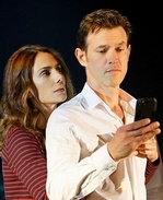 Instead, what Ms. Headland has done is to apply her knack for smart and often funny dialogue to her own twisty Strangers In the Train spin-off as a way to combine a noir-comedy and a darker drama exploring the difficulties people have in really getting to know and understand each other or themselves. She cleverly introduces mentions of the famous Highsmith story. The tie-in to Highsmith is timely as well as clever since the work of this queen of crime dramas has been riding a new wave of popularity since the W.W. Norton publishing company re-issued all her books; also last year's stunning film Carol, named for the main character in her Lesbian novel The Price of Salt. I wish I could report that Headland's combination of the thriller and guy-meets-girl comedy genre with a very dark look at the often troubling aftermath of lies and self-deception lived up to its inspirational source. Though Layover does indeed do so during those above mentioned scenes, it becomes flat-footed once the initial interchanges predictably evolve from strangers-on-the-plane chatter into a bedroom scene. It does regain its footing at the tense beginning of the final scene, but not long enough to avoid a too contrived, unsatisfying crash landing. Here's the set-up that has us following Shellie and Dex's Thanksgiving meeting as seatmates in a Chicago to New York plane through six scenes in just 90 minutes: He's a good looking suit and tie guy; she's more casually dressed, but also attractive. The initially hostile conversation warms up when the flight is canceled and the passengers are put up in a hotel. If we're to believe what Shellie and Dex tell each other, she's 35, a happily single crime fiction teacher at Hunter College. He's 42, an engineer, engaged but somewhat problematically so. But there are plenty of easy to spot, sly little hints to turn up our skeptics' antennas about the information being exchanged. Our skepticism is ultra realistically confirmed in the play's mid section that show us what happens after that Thanksgiving layover. Shellie's situation with her family and Dex's with his fianceé and her young daughter play out simultaneously. This brings the four other cast members into the picture: Amelia Workman and Arica Himmel as Andrea, the fianceé and the spoiled young Lily . . . John Procaccino as Fred, her father and Quincy Dunn-Baker as Kevin, her husband (Clearly Shellie's self representation most potently exemplifies how people often present themselves to strangers as they'd like to be rather than what they are. The simultaneously staged scenes do allow Shellie and Dex to face each other from their real worlds often enough to make it clear that one night stands aren't always so easy to forget. However, despite Trip Cullman's sturdy direction, this departure from two strangers connecting and following through on their sexual attraction to each other, detracts from the mood instead of being all that interestingly revealing. That said, the entire cast is outstanding, especially Annie Parisse and Adam Rothenberg and Quincy Dunn-Baker in his second role as Arno, the gumshoe. (Note that as of 9/06 Maria Dizzia will take over as Shellie since Parisse is slated to begin filming a Netflix show). Besides the excellent performance there's the scenic and video design by Marc Wendland and Jeff Sugg to make Layover worth seeing. Wendland has ingeniously backed the wide stage with a row of large monitors that change content again and again — from a fast moving panorama of an airport's runway at the beginning and finally to Sugg's flashing images of 1940s and 1950s crime diva stars. Wendland, Suggs, and the entire entire crafts team are the real scene stealers here. This is Curtainup's third encounter with team Headland and Cullman. Bachelorette premiered at 2nd Stage's uptown venue, Assistance at Playwrights Horizon |