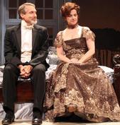 When you think of a musical in waltz time, Stephen Sondheim isn't likely to be the first name to pop into your mind. But this genius composer-lyricist (and I don't use that genius adjective lightly) is indeed the man who adapted Ingmar Bergman's 1955 film Smiles of a Summer Night into a waltz-tempo driven show renamed for Mozart's serenade "Eine kleine Nachtmusik" and with a distinct kinship to A Midsummer Night's Dream. Sondheim's typically ironic voice added a bittersweet flavor to librettist Hugh Wheeler's romantic fairy tale. Though some critics deemed Wheeler's book and Sondheim's penchant for darkness as incompatible, A Little Night Music's 1973 premiere Broadway production ran for more than 600 performances. And since then, this sophisticated tale of an interlinked series of romantic entanglements has crossed genre boundaries with productions in opera houses as well as theaters. The complex characters and rich music have attracted stellar actor-singers to interpret and bring out the lyrical complexities of the breakout hit "Send In the Clowns," as well as other ear clingers like ", " "A Weekend in the Country" and "The Miller's Son." The most recent star-driven Broadway revivals featured Catherine Zeta-Jones and Bernadette Peters as Desiree Armfeldt and Angela Lansbury and Elaine Stritch as the wheelchair bound Madame Armfeldt. ( Review). Even without a high profile cast, this highly intellectual yet wonderfully accessible musical can enchant Sondheim's many fans, and seed new Sondheimians — one example right here in the Berkshires: Barrington Stage's terrific production back in 1998 ( Curtainup review). Clearly its time to give Berkshirites a chance to have another look and listen at this lovely but all too rarely revived show. So thank you to Berkshire Theater Group for doing that, even if its production isn't flawless. (probably honors for the most perfectly cast and beautifully stages version ever reviewed at Curtainup belongs to the 2004 production at the Los Angeles Opera House ( Review ). As Hugh Wheeler's book insured that the various couples overcame their repressed feelings and regrets to wind up properly paired for a final hopeful waltz, so the current production has enough assets to make it well worth seeing. Nathan Darne's 11-member pit orchestra and the voices of the entire cast do full justice to the sublime score which is the pulsating heart of this show. While Maureen O'Flynn' isn't the most nuanced Desiree I've ever seen, her voice is gorgeous and she does deliver the goods with the show stopping "Send in the Clowns." No reservations about Greg Edelman. He gives a fully rounded performance as Frederik, Desiree's emotionally shut-down former lover who's now in a frustratingly unconsummated marriage to Anne (Phillipa Soo, the stunning Natasha of the immersive hit show Natasha, Pierre & The Great Comet of 1812 ) who inevitably succumbs to her stepson Henrik's (Matt Dengler) love for her. Penny Fuller arms Madame Armfeldt with the wit and wary wisdom of a once glamorous courtesan, especially during her stunning solo, "Liaisons," during which she regrets the passing of a more tasteful era, (". . .In a world where the princes are lawyers,/ What can anyone expect Except to recollect. . "). Two of the most delightful characters are Desiree's pompous, adulterous Count Carl-Agnus Malcolm and his often betrayed Countess. They're delightfully played by real life marrieds Kate Baldwin and Graham Rowat. His solo "In Prase of Women" and her poignant "Every Day a Little Death" are highlights. In the penultimate solo number, "The Miller's Son," Petra (Monique Barbee) declares herself ready to find a waltzing partner other than young Henrik, thus leaving everyone neatly paired. Though the Grecian costumes and props seem unnecessary to clarify the function of the quintet of singers (Ashton Heyl, Denis Lambert, Jamilyn Manning-White, Patricia Noonan and Eric Van Tielen) their singing is dazzling. That brings me to the downside of this production, which is a lack of style which even Sondheim's elegant music needs. This is attributable mostly to Ethan Heard's often clunky direction and the budgetary axe that seems to have been applied to the scenery (happily, definitely not David Murin's costumes!). Putting Frederik and Anne into one of the Colonial's boxes for the scene at which they attend a performance by Desiree is a nice directorial touch. Heard is also apparently a good listener and paid attention to some early audience complaints about staging the second act's banquet scene with the characters seated with their backs to the audience. However, while this was an easy last-minute fix to make, there's no fixing of the second act's tacky cardboard scenery for Madame Armfeldt's estate. Granted, the show's last Broadway revival, also came in for its share of negative comments about its quite modest scenery. However, Reid Thompson's scenery is so unattractive that it's downright distracting. Also, by having so many scenes play out in front of the curtain puts undue emphasis on the scenery's shortcomings. Still with so many richly musical and sophisticated songs, articulated with humor and poignancy as needed, this A Little Night Music is more than a little enjoyable.