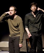 Joel, the precocious youngster who created the sock puppet Greek Tragedies described in the above quote may or not be Jenkins' alter ego. But I suspect there's a lot of Joel in both both him and Stanton. For sure, the two men had a great deal of fun creating this backstage/onstage two-hander: the story of the events pertaining to an adaptation of Euripides' Ion played out on the 59E59 Theater A stage when A Body of Water is dark. Like Joel, Jenkins and Stanton fearlessly take on male and female characters and enact their multi-faceted interconnected story without sets or costume changes. They even do their own sound effects. Primary Stages deserves a resounding shout out for smart management. Allowing Love Child to occupy the theater when the company's main production is dark makes economic sense. Naturally, it requires a play that can function without dismantling the other play's set. While the program for Love Child does feature some designer credits, Neal Patel's contribution consists of six mismatched chairs and a few drop cloths tossed over his more elaborate Body of Water set. If costumer Candice Donnelly made any contribution, it must have been to help the actors decide which slacks and t-shirts to pull out of their apartment closets. But there are more reasons this dual scheduling deserves applause: It gives two new playwrights a chance to try out their work before an audience and, being actors as well as writers, to give themselves a thorough workout. What's more, the minimal production costs give Primary Stages a chance to offer audiences live theater for the price of a movie. What about Love Child's entertainment value? The actors' energy and versatility and their lightning fast character switches are something of an acting master class. Their farce isn't serious competition to the likes of Boeing, Boeing but Love Child is also a farce. However, it relies on the escalating zaniness and the speedy and, at times almost simultaneous, back and forth jumps among some twenty character to substitute for a conventional farce's slamming doors. For all its barest of bare bones structure and the emphasis on lots of laughs, the play also insists on donning a serio-comic double mask, and the result is poignant but also something of a mixed bag. At the heart of the farcical Greek tragedy is a family whose careers are in a downward spiral: Joel, an actor and director of a theater company dedicated to updating classics (to wit the Euripides Ion that he's staging in a Brooklyn warehouse); his father Richard is also an actor whose latest gig is as Funnybones, a clown for a restaurant chain); and Ethel his has-been agent and mother whose all about Eve assistant has deserted to William Morris with all her clients except Joel. Amusing and at times amazing as the navigation among these and the other characters are, the actors' moving to different chairs as a means of signalling their change of character gets to be somewhat tiresome and requires really close attention to avoid confusion. Carl Forsman's direction strikes the exactly right mood and pace, with just enough pauses in the ever mounting frantic doings. However, some of the shtickier funny business, like Ethel and Kay's bathroom exchanges are excessive and Forsman might have been well advised to persuade Jenkins and Stanton to stick to the play's original 65-minute run time. At 80 minutes, the chair hopping persona changes sag at midpoint. Fortunately, the savvy auteur/actors evenually pick up fresh steam by zestfully breaking the fourth wall and invading the audience's territory — giving a nip and tuck to the sagging serio-comic mask.