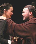 Of course the obvious themes have to be covered properly too, and as usual TFNA assembles the cast and crew to manage the task. Peter Ksander's set — an elevated cage-like balcony and stage level metal doors which slam shut during entrances and exits— perfectly represents the merciless justice fetishized by too many characters in the play. Both sound and lighting compliment the feel of black and white morality which dominates the work. David Zinn's costumes are similarly successful, reflecting a kind of Victorian sensibility appropriate for the tone of the play. Even the music (Sarah Pickett), winding its way from rave-like clubs to royal flourishes to the soft blues which capture Mariana's sad lament for her unfulfilled marriage, blends nicely into the work's overall vision. In part, that vision is a rather ugly one. Angelo (Rocco Sisto), left in charge of a dissolute Vienna by the supposedly absent Duke Vincentio (Jefferson Mays), begins immediately to crack down on the vice which has been permitted (or at least ignored) for nearly fifteen years — a problem which the Duke had both anticipated and desired but believed himself incapable of addressinggiven his previous leniency. But in fact the Duke has not left Vienna, choosing instead to disguise himself as a friar and observe not simply Angelo's rule but the citizens' reaction to it. When Claudio (LeRoy McClain) violates a seldom-enforced law against fornication with his fiancée, Angelo decides to make an example of him by enforcing the old penalty of death. When Claudio's sister, the beautiful and pure Isabella (Elisabeth Waterston) goes to plead on her brother's behalf, Angelo's stern morality goes out the window, and justice is forced to contend with hypocrisy for the rest of the play. Had the production gone no farther than this, it would have been competent but not memorable. But Arbus takes the risk of plumbing the depths of the play for more subtle themes and finds gold therein: Angelo is certainly too severe in the beginning and monstrously hypocritical in the end, but Isabella is no less puritanical in her outlook. When she calls her terrified brother Claudio a "beast,""faithless coward" and "dishonest wretch," hoping that he "diest quickly" rather than saving him by surrendering her body to Angelo, it's hard not to see the Duke's deputy and her as more of a piece than we might have suspected at the beginning. And this is, of course, the true point. Shakespeare's objection was not to tyranny as such, but severity in general. In this context Isabella's impenetrable moralizing — "Lord Angelo, having affairs to heaven, / Intends you for his swift ambassador," she says to Claudio without irony, apparently intending some form of perverse comfort. Yet this seems little different than Angelo's fetishization of the law. That Arbus picks up on this similarity is remarkable and critical for the play's success. The acting is, for the most part, of a similarly high standard. Sisto carries his Angelo as rigidly unyielding as one could wish. Waterston makes Isabella at least partially (and I think rightly) unlikable in a subtle and unusual way. The rest of the cast, from Alyssa Bresnahan's sympathetic Mariana to Alfredo Narciso's surprisingly nuanced Lucio, is generally quite good (with a couple of minor exceptions). But the star truly is Jefferson Mays, who shows his Tony-winning pedigree with a performance both broad and deep. The Duke, who must expertly navigate between severity and leniency, has to be utterly human if the play is to work, and Mays gives him the perfect combination of authority, cunning, compassion and self-doubt. When the Duke pronounces his sentence toward the play's end, we become aware that he is testing both Angelo and Isabella, and watching his reaction to the result is striking. It is a first-class performance. In fact, the whole production is first-class, and ultimately the credit for that has to go back to Arbus. If this is what we have to look forward to— a smart and subtle young director combined with the TFNA's unfailing professionalism —we're all in for many more years of high-quality classic drama. If you want to say you were there when that all started, go see this Measure for Measure as soon as you can.