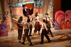 As The Megile of Itzik Manger chronicles, the deliverance was achieved through the wisdom of the hero, Mordecai (Mordkhe) and the loyalty of his niece, Esther, who marries the king (after his first wife, Vashti, refuses to come when called) and gets the king to change his mind. The story is told in the biblical Book of Esther, known as the Megile. The Purim spiel also tells this story, but in a more comic dramatization. This show, produced by The National Yiddish Theatre/ Folksbiene, follows the latter tradition. While my children were growing up, I wrote many Purim spiels in which the entire family performed. The songs and themes I integrated into the spiels reflected American culture and more particularly, American musical theater. And so I was pleased to learn in the delightful Yiddish and Purim spiel lesson given by director Motl Didner 45 minutes before every performance of The Megile of Itzik Manger, except the Sunday matinee, that the spiel from its very beginning reflected the culture surrounding the Jewish community. The Purim spiel was born in renaissance Italy. As the holiday arrives at the end of February or the beginning of March, it coincides with the beginning of Lent or the Mardi Gras. Thus Purim festivities have many of the trappings of the gentile holiday as it was celebrated at that time: parades, puppets, masks, clowns and all sorts of revelries. All of these elements are outstanding in Folksbiene's production of The Megile of Itzik Manger, which is based on the landmark production that starred the Burstein family, featured sets and costumes by the circus innovator Jenny Romaine and used the poetry of Yiddish poet Itzik Manger. The cast of twelve is led by Tony nominee Stephen Mo Hanan, who plays the clownish King Akheshveyresh. In this retelling, the story has been changed considerably. The king doesn't just ask that Vashti (Rebecca Keren) appear before him; he demands that she parade naked in front of his ministers, which she refuses to do ("Vashti's Song of Protest"). Although Esther (Stacey Harris) agrees to marry the king, she is really in love with a handsome, young tailor named Fastrigrosse (Andrew Keltz). And Esther is not quite as faithful as a good Jewish wife might be ("The Song of the Golden Peacock"). Both Harris and Keren are vocal powerhouses. Didner made the clever choice to cast Jonathan Brody as both Homen and his foil, Mordkhe. This only adds the the exuberant foolishness of the show. The retelling of the Purim story is accompanied by dance, juggling, acrobatics and song. Young men play young ladies to great comic effect. The king wears a clown's nose. Mordkhe has a ridiculously long and ample beard. Joyful klezmer music never lets the pace slacken. The Megile of Itzik Manager has arrived onstage two months after Purim. The megile has been read, the noisemakers and costumes put away for next year. But when a show is as much fun as this, even without a holiday, it's cause for celebration.