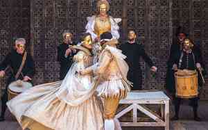 While Rachel Pickup is a lovely and elegant Portia, her performance is not as richly nuanced as Phoeobe Pryce's Jessica. While I'm quibbling, I found the way Antonio (Dominic Matham) is strapped to a cross-like bar for Shylock to extract his pound of flesh too obvious a visual metaphor to explain the history of anti-Semitism based on images of Jews as Christ killers. On the other hand, the way the often referred to erotic undercurrents between Bassamio (Dan Fredenburgh) and Antonoio are forcefully handled in a brief, wordless scene that underscores that people Bassiano reject any type of outsider. Perhaps the all too valid parallels of this troublesome play's issues to the world we live in, accounts for this season's multiple re-interpretations. |