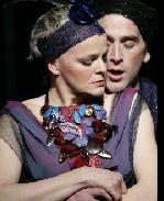 There are no bananas but plenty of fruitcakes in this delectable production, under the spell of conjuring director Tina Landau. This Dream is not only embraced by an original score and songs by GrooveLily, a New York-based trio, but is set in motion by them. This is a particularly lively, comedy-driven production that also revels in the formidable and fantastical. Undoubtedly the result of too much rehearsing, Gene Lewin (drums), Valerie Vigota (electric violin) and Brendan Milburn (piano) have fallen fast asleep on their blue neon-lit bandstand. They are off on a concerted dream to which we are all invited. The small black frame that has contained their bandstand expands to reveal a thoroughly intoxicating dreamscape. The trio becomes part of a magical world as musical creators and conduits and as characters/participants in the action. Their music, sensual, glib, romantic and raucous, delights throughout with its varied and eclectic musical vocabulary traversing rock, blues, Broadway, folk and jazz, even a passing nod to Kurt Weill, but mostly defined by its originality and independence. A program note acknowledges that all the lyrics are written by Shakespeare (no wonder they are so good) with exception of the songs "When I Dream" and "While You Were Sleeping" (almost as good). Curiously the program does not list the songs, some of which are no more than snippets. We are transported to the silver and white royal court of Athens, its courtiers in white and gold 18th century attire and gathered beneath flickering sconces that adorn the walls. Landau’s concept of fairydom is delightfully capricious, as it fairly re-invents our belief in fairies as Landau has opted to ignore their dark side which usually affords another dimension to the story. However, she commands our attention with her vigorous and lively approach to the action scenes. There are issues of pacing that will undoubtedly be ironed out during the run. Otherwise, there is rarely a dull moment as we watch the consistently strong stage pictures, including a floating garden for Titania. An ensemble member of Chicago’s Steppenwolf Theater Company, Landau is a director/writer who takes risks with risky projects. Her lauded collaboration with composer Adam Guettel on the musical Floyd Collins is a notable achievement, as was the delightfully re-vitalized Gershwin musical Of Thee I Sing for the Paper Mill Playhouse, a few seasons back. Hippolyta, Queen of the Amazons (Ellen McLaughlin, who also doubles as Titania, the Fairy Queen) appears elevated for a fitting, as if she were the figure to be placed on the top of an all-white wedding cake. She is about to be wed to Theseus, Duke of Athens (Jay Goede, who doubles as Oberon, the Fairy King.). As you may guess, this wedding isn’t about to go off without a hitch. There is nothing 18th century about the trendy mod clothes worn by those love-possessed Athenian youths Lysander (James Martinez) and Demetrius (Will Fowler) who both claim to love Hermia (Stacey Sargeant), who prefers Lysander. The young lovers were well paired and perfectly at ease with the rhymed couplets either sung or spoken. But Sargeant’s Hermia was an especially delightful little vixen, bringing a vivacious and exhilarating quality on stage "though she be but little, she is fierce.". And there’s nothing 18th century about the hip body language or rock styled singing that is ignited by their passions. Things are only destined to get more complicated when Hermia and Lysander take refuge in a forest wherein they are confronted by Helena (Brenda Withers), who still loves Demetrius, who loves…well, you know. It’s also into the woods for Shakespeare’s most adored amateur actors, here re-considered as city laborers and hard hats, who meet to rehearse "The most lamentable comedy, and most cruel death of Pyramus and Thisby." The laughs they generate are prompted and sustained easily by Lea DeLaria, who assumes the role of Bottom, a city sanitation worker. DeLaria, who earned her Broadway stripes in Rocky Horror Show and On the Town, has her best role yet. She makes an attention-getting entrance across an aisle hauling a huge garbage can. Although I didn’t know what to make of that raw carrot she periodically pulls out of her overalls and chomps on, I was smitten with her as much as was the drugged Titania when Bottom is turned into a most endearing ass. DeLaria gets plenty of comic mileage playing Thisby whose protracted death does not come easily or without the prone DeLaria’s tuba solo. As Pyramus, Demond Green gives drag a new dimension and brings down the house with his octave-spanning vocal dexterity. Gravel-voiced Stephen Payne gets his prescribed laughs as the boozing Peter Quince, and as Hermia’s stubborn father Egeus. As designed by Louisa Thompson, the forest is a breathtaking vision of silver ladders, poles, harnesses and swings on which muscular fairies float and fly with grace in their spandex briefs, with credit to the aerial design/choreography of Christopher Harrison. The forest is also prone to whimsical changes of weather from falling snow to falling autumn leaves, the thunder of an incoming storm, and the appearance of a starry moonlit sky. Committed to stealing some of the thunder and doing so is Guy Adkins, as a glistening Puck, with a flair for accessorizing his red briefs, and a penchant for mischief. Best of all, this production is performed with an awareness of its bubbly poetry. Combining gaiety of spirit and belief in the incidents, a diverting evening has been created. Luckily, and considering the ability of many of the performers, we don’t have to be overly concerned with the depths of character analysis since the play’s interest seems primarily to deal with incidents and coincidence, and in this case, everyone’s ability to perform the Macarena. Kudos to costumer Michael Krass, who knows who to dress and undress with equal panache. This first co-production between the McCa