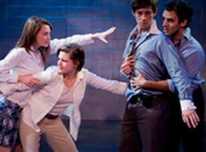 Theseus (Benjamin Lovell) and Hippolyta (Melanie Julian), the ancient ones, frame the play. It begins when the Athenian hero anticipates his impending nuptials with his Amazon queen, and it ends with the marriage celebration. In fact, this light and gay play will be resolved with several weddings. That's not to say there won't be angst and comic uproar right up until the end. The denizens of the play are mad with love — gender-bent love, permanent love, and temporary love. A problem is brought to Theseus's attention: Hermia (a girl) is supposed to marry Demetrius (a boy), but she has fallen in love with Lysander (here, a girl). Hermia refuses to marry Demetrius. A friend, Helena (here, a boy) loves Demetrius. Got it? (These four very fine actors are respectively: Erin Mulgrew, Sean Gibson, Emily Letts, and Patrick Joyce.) Hermia's unhappy father, Egeus (Nick Anselmo) is the impediment that gets things started. When his daughter won't marry her fiancé, he takes his case to Theseus and demands his legal rights (which come up on a screen). Played self-possessed and courtly by Benjamin Lovell, Theseus upholds the law. Hermia must marry Demetrius. Her alternatives are nunnery or death. Lysander and Hermia decide to run away to the woods to escape her sentence. Text messages ensue and Helena and Demetrius follow and head for the woods. Helena is not usually a particularly interesting character, but here he is quite captivating as a gay theme twists things around. Cut to the fairies. (Whenever this word is used it has that double entendre ring.) The fairy world is introduced with rope lights and dramatic music. Oberon and Titania, the resident royalty, are a sight to behold in Lauren Perigard's costumes. Titania (Sean Thompson) is a fascinating, bitchy royal pain in a long black robe and black boots. Oberon (Charles Illingworth IV) is handsome in his black leather-fetish dress and platform boots. Their four attendant fairies, all talented and totally tuned in, do a lively Janet Jackson kind of dance. (They are Richie Sklar, Justina Ercole, Steve Fala, and Eileen McHugh.) The fairy royals are in a dust up over Titania's Indian changling boy, whom Oberon wants and she won't give over. It's just an excuse, really, for Oberon to exact revenge and get things rolling in terms of the elaborate plot. He instructs his cute-as-a-button, mischievous sprite, Puck (Brent Knobloch), to cast a spell on Titania with the nectar of a cool looking, lighted flower. The fact that the flower referred to in the play is a pansy doesn't come up, but it would have been an interestingly impertinent note in a queer reading. Under the flower's spell, Titania will fall hopelessly in love with the first thing she lays eyes on when she awakes. And it is arranged that she will fall in love with a most unsuitable thing. In case you don't know the whole story, I will leave this bit alone. The flower spell is also cast on the young lovers, but uh-oh!, Puck messes up, which results in the ensuing mixed up, fast-paced action. It's complicated. Nearby, Peter Quince and his band of mechanicals— all English laborers in a maze of high class Greeks— prepare a show for the big wedding. It is about Pyramus and Thisby, lovers who are kept apart by their parents. In addition to the star-crossed lovers, the little play famously features a wall and a lion. All the actors in the comic troupe do wonderfully solid nerdy performances (Stephanie Cryor, David Quinn, Owen Pelesh, Rebecca Sherman, Will Poost). Well-meaning, good natured Bottom, a beloved Shakespeare character, is among them. Danielle Pinnock, a natural comedienne, is a marvel. Her Bottom is over the top, and the audience loves it. But enough about bottoms and tops. Perigard's costumes for their Pyramus and Thisby play are a hilarious vision that draws extended laughs. The young lovers, fairies, and comic craftsmen are the play's focus. In that interest, the small framing parts of Theseus and Hippolyta have been pared down. Their connections are underplayed (like their former romantic links with the fairies). Due to the exigencies of time and our predilection to cut to the chase, the two are almost conflated here. And it is Ms. Julian as Hippolyta who, with great poise and a lovely dignity, delivers Theseus's well known discourse near the end. Just one thing doesn't really work --for some reason the setting is a school. However, other than a logo projected at the beginning (so in touch with today's education branding madness) and plaid uniforms, there is no trace of school to be found. But the unneeded theme quickly fades as the midsummer dream takes over. Directors Peter Reynolds and Lynne Innerst elicit focused performances from their actors, with an emphasis on clarity and vibrancy. They also handle the slightly difficult ending creatively and sensitively. Shakespeare's resolution has a little problem: The lovers are all abruptly and neatly patched back up. After Hermia's heartthrob has seriously dissed her, for her to just go along with Lysander's flip and sudden unapologetic return never did sit quite right. But here, compensatory action outside the script helps to solve the problem. For Hermia needs to come to terms with the denouement and be won over after her beloved's recent vehement declarations of non-love. Taking the moment to deal with it is a very effective directorial move. Chris Colucci's clangy, original "funky techno punk" music wraps around this show, and his sound design includes a surprise musical number. Reynolds and Innerst, who deftly adapted the play, are tuned in to audience interests: We like it all to fit into 1.5 hours. We have little patience for drawn out formalities, and like Shakespeare's own audience, in a comedy we are captivated less by elegance and eloquence than by love's mishaps and madcap action. Add electronic media, and stir. Mauckingbird's production is an airy delight.
