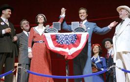 The very serious issues and the nastiness of the current presidential campaign have seeded a spate of sober, well-meaning political films and plays. But leave it to a 1931 musical cartoon about depression era presidential and vice-presidential elections by George S. Kaufman & Morrie Ryskind, with delectably hummable and sardonic songs by George Gershwin & Ira Gershwin, to skewer the flimflam with wit and humor. Director Tina Landau's revival of Of Thee I Sing recaptures the play's frothy silliness and does honor to the musical pleasures that range from ballads to Gilbert and Sullivan-like patter songs. Abetted by peppy choreography, terrific stagecraft and a bracingly big cast, this is likely to unite Republicans, Democrats and undecided voters. Well, probably not -- unless all the candidates, their running mates and managers take time out from their acrimonious campaign to spend two hours at the Papermill Playhouse. While Of Thee I Sing was the first musical ever to win a Pulitzer Prize, it was the second polical musical of the 1931-32 Broadway season. Moss Hart and Irving Berlin's Face the Music, which opened first, shone the spotlight on New York Mayor Jimmy Walker and his corrupt administration. Of Thee I Sing took broader, less specific aim at ineffective politicians, and the power of their vacuous campaign slogans to appeal to a public more interested in their private lives than their public policies. The plot in a sound bite is this: None too bright John P. Wintergreen wants to be President. His credentials are, to put it mildly, vague. His cigar smoking advisers cook up a scheme to give the campaign a sure-fire victory theme-- love. The plan is for an attention-getting national beauty contest, its winner to become Mrs. Wintergreen. Wintergreen reneges on his commitment and rejects the contest winner, a sexy Southern belle named Diana Devereaux, for his corn muffin baking aide, Mary Turner. The triumph of corn muffins over justice sees him simultaneously sworn in and married on the Capitol steps. Act two finds the Wintergreens ensconced in the Oval Office but the ghost of the rejected Southern belle haunts the presidency when she turns out to be a descendant of Napoleon. The threat to U.S-French relations by Wintergreen's unwillingness to leave Mary for the litigious Diana brings a move to impeach Wintergreen and replace him with the heretofore ignored vice-president Alexander Throttlebottom. Naturally, all ends well. All this silliness is carried out with great aplomb by the cast. Ron Bohmer and Garrett Long are well-matched as the presidential couple, and sing well, especially the patriotic title song and "Who Cares?" Wally Dunn's Veep is an adorable nonentity, Sarah Knowlton plays Diane Devereaux with larger than life magnolia blossom sexiness. Adam Grupper, Nick Corley, Richard Poe, Hal Blankenship, and Herndon Lackey ably pull the strings to carry Wintergreen to victory, with Grupper especially amusing in his homage to Groucho Marx portrayal. Fred Berman's French Ambassador is the undisputed show stopper. His "The Illegitimate Daughter " and his exit are priceless. Sean Palmer and JoAnn M. Hunter seem to have been cast as two of Wintergreen's aides mainly to showcase Joey Pizzi's choreography-- which they do with pizzazz. The company not only does well by the the "Of Thee I Sing" reprise, and "Love is Sweeping the Country," but the less instantly recognizable tunes. The red white and blue color scheme that predominates Walt Spangler's snazzy scenic design (which includes banner draped walls all around the theater and a 48-star flag curtain) and James Schuette's parade of snappy costumes contribute to the political aura. Projection designer Jan Hartley has brilliantly translated Wintergreen's triumphant ascent to the White House into a newsreel. But perhaps the most inspired visual touch comes when four actors, each attached to a look-alike dummy, play eight Supreme Court judges. Of course Of Thee I Sing preceded the trend for fully integrated musicals that came with Oklahoma and is therefore as much operetta as musical. Director Landau has wisely refrained from tinkering with this but has allowed the show remain true to what it is, letting the Kaufman and Ryskind script make its own case for its timeliness and endurance -- and its depressing parallels to today's politics. While Hillary Clinton refused to be seen as a cookie-baking presidential mate, the current race might just be close enough for Teresa Heinz Kerry or Laura Bush to pull out their muffin pans. A basic recipe calls for 3/4 cup all-purpose flour, 3/4 cup yellow cornmeal, 1 tablespoon sugar, 2 teaspoons baking powder, 1 teaspoon baking soda, 1/2 teaspoon salt, 1 large egg, 1 cup buttermilk, 1/4 cup butter, melted. The instructions: Preheat oven to 400 degrees. Grease muffin tins or line with paper cups. Combine flour, cornmeal, sugar, baking powder, baking soda and salt in a bowl. Mix with a fork. In another bowl, whisk egg until smooth. Whisk in buttermilk and melted butter to combine. Pour into flour mixture and stir until evenly moistened. Fill muffin cups three-quarters full and bake 15 to 20 minutes. Michael Gennaro, whose first producing season at Paper Mill Of Thee I Sing represents, has lined up an interesting season of some things old and some things new. In the something old category, a production of another old musical, She Loves Me (October 27th to December 5th) and a play popular at many regional theaters, The Drawer Boy February 23 to April 3rd). In the something new category, two new musical adaptations of famous films, Harold & Maude (January 5 to February 6) and The Baker's Wife (April 13 to May 22).