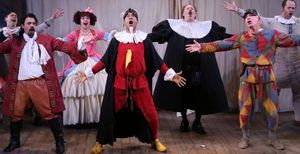Goldoni (1707-1793) wrote more than 250 plays and opera libretti. Outside the Italian-speaking world, he's remembered primarily for The Servant of Two Masters. In that script, which dates from the middle of the 18th century, he captured for posterity stock characters and some narrative conceits of the unscripted commedia dell'arte tradition. Commedia dell'arte was the most populist of entertainments, performed by peripatetic players in any available venue — inns, parks, even along the roadside. It's unlikely that many of the actors in the bands that toured with commedia repertory had much education. Their bawdy, freewheeling scenarios were handed down from generation to generation during the better part of two centuries before Goldoni's birth. Truffaldino (Steven Epp), the servant of Goldoni's play, doesn't realize that that the man for whom he works is recently deceased and impersonated by a woman, Beatrice (Liz Wisan). The disguise is part of a scheme by which Beatrice hopes to claim the dowry that would have come to her brother had he lived to wed Clarice (Adina Verson), the daughter of Pantalone (Allen Gilmore). While Beatrice's attention is elsewhere, Truffaldino signs on with another employer to make extra money. By the kind of coincidence common in farce, Truffaldino's second master is Florindo (Orlando Pabotov) to whom Beatrice is engaged and whom she believes to be back home in Torino. Needless to say, Truffaldino's moonlighting leads to farcical chaos when both masters start making urgent, often conflicting, demands. In commedia dell'arte the lineaments of plot were primarily occasions for improvisational clowning by actors playing stock figures. The stock characters appearing in The Servant of Two Masters include a couple of clowns or zanni (Epp and Liam Craig), two pairs of lovers (Wisan and Pabotoy; Verson and Eugene Ma), a couple of none-too-wise fathers (Gilmore and Andrew Grotelueschen), and a quick-witted, sharp-tongued young serving woman (Emily Young). The version of The Servant of Two Masters now being presented under the auspices of Theatre for a New Audience began at Yale Repertory Theatre, where it ran in 2010. Since then it has been seen at the Guthrie Theater in Minneapolis and The Shakespeare Theatre in Washington, D.C. Directed by Christopher Bayes, the Head of Physical Acting at Yale Drama School, the production utilizes a translation by Christina Sibul, adapted for contemporary performance by American playwright Constance Congdon (Tales of the Lost Formicans). Bayes and Epp, who is Co-Artistic Director of Theatre de la Jeune Lune, are credited with "further adaptation." Designed by Katherine Akiko Day (scenery), Valerie Therese Bart (costumes), Chuan-Chi Chan (lighting), and Charles Coes and Nathan A. Roberts (sound), the production is filled with visual and aural suprises. The stage is decorated with miniature palazzos and a handsome church dome. The sky above the Gulf of Venice is a field of della Robbia blue with Magritte-inspired clouds. The evening opens with a couple of clowns who, flashlights in hand, blunder onto a dark, empty stage where they discover the trunks of a commedia troupe. Sorting through masks, costumes and other theatrical paraphernalia, they release a host of fireflies. What follows is exquisitely picturesque: the two clowns chasing after blinking fireflies in an auditorium dimly illuminated by multicolored fairy lights. During the play's two-plus hours, the cast of classically-trained actors engage in energetic slapstick. They make knowing references to American pop culture, the recent presidential election, sing charming ditties, and engage in banter with the two-person band (Christopher Curtis and Aaron Halva). In the tradition of commedia dell’arte, many jokes are risque. There are a few instances of out-and-out vulgarity, but only one gross-out moment. The proceedings close in a manner as picturesque as the beginning: an outsized crescent moon rises over a wild goose chase involving 11 actors and all the aisles of the orchestra section of the Polonsky Shakespeare Center. For people who like farce, all of this is heavenly stuff. For those in the anti-farce camp, it's likely to be torture. |