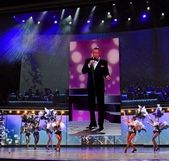 However, by using technically sharpened up video from Sinatra's life, we can see every expression on his face. Without the benefit today of You Tube videos this would be an exceptional treat but when you add good sound, a 24 piece live orchestra, outstanding video backdrops and the London Palladium, where Sinatra appeared, it does make you feel as if you have the man himself. The biographical detail is in his own words, with Sinatra telling us about his birth and his grandmother at his birth getting him to breathe. He perforated an eardrum at birth which kept him out of the military. These recollections are accompanied by evocative sepia photographs of the shops of Hoboken New Jersey, Sinatra's birthplace. There are more spoken details about his career, his four marriages including his first wife and mother of his three children, Nancy Barbarto Sinatra, wonderful pictures of the beautiful Ava Gardner, Mia Farrow and Barbara Sinatra. The opening number is "Fly Me To The Moon" with dancers dressed as air hostesses and flight captains. It is slightly incongruous watching the miniaturised dancers and the large elongated screen facials of Sinatra, as if he is a singing Gulliver in a world of dancing Lilliputians. Behind are shots of aeroplanes taking off and landing and then astrological symbols from a chart of the heavens tumbling. The initial screens are drop down but later some of the film of Sinatra has been blended with backdrop photographs which is visually really effective. "It Was A Very Good Year" is interposed throughout the show at the right time in Sinatra's life — at 17, at 21, at 35 and later "in the autumn of the years". This song is so meaningful and Sinatra conveys an emotional depth to the nostalgic lyrics that this was my favourite in the show. Set in a bar with a filmed bartender busing behind the bar, "One For My Baby" has Sinatra acting the words like someone drowning their sorrows alone in the early hours and giving the song a real punch. Most of the film of Sinatra is in black and white but often the background has been coloured to link it to the stage set which is technically and visually exciting. "Pennies From Heaven" sees it raining and the raindrop exploding in bursts of orange. We hear about his supporting acting role in <From Here To Eternity for which he won an Oscar. Songs from wartime show pictures of the troops and families saying goodbye, sometimes forever. The production has been well planned with amazing love songs "I Got You Under My Skin" with photographs of Ava Gardener. The Las Vegas scenes have playing cards to "Luck Be A Lady" and there are photographs of the members of the Rat Pack. "The Lady is A Tramp" sees the dancers dressed as film star icons. "My Funny Valentine" is accompanied by pictures of Sinatra with Mia Farrow. "New York, New York" has show girls in feathers and an older Sinatra now in full colour before building up to Sinatra's definitive signature song, "My Way". On the whole, although the dancers are very proficient, I found the choreography distracting rather than enhancing. I felt as if I had seen the man himself in this richly textured show with its exciting technical imagery and the music which doesn't seem to date with its charming interpretation. Sadly we couldn't call for a sung encore!
