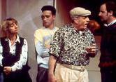 Thus, while monthly spraying may keep the exterminating tycoon's pre-fab vermin free, it does not prevent homo sapiens from entering the premises with keys its owner did not intend them to have. But even before the Maggots or son Rocky arrive, the lord of the manor returns prematurely from a golfing vacation. The sound of the key in the door and voices in the hallway sends Weasel scurrying for the closet -- but not before grabbing variation of the tool of his trade, a real gun. And there you have the premise of Mike Leigh's spin on the kid caught with his fingers in the cookie jar -- the kids in this case being the working class Maggots plus Rocky and Melanie-Jane (the upper class dumb blonde with whom he intends to have sex on mum and dad's king-sized bed). Dad's arrival sends Vic and Charmaine into two of the remaining closets. As the symbolism of Mike Leigh's character naming conventions is as transparent as the water in the apartment's bathroom bidet, so are the farcical complications inherent in Rex's unexpectedly aborted holiday and the truths that are revealed to these "skeletons" in the closet. Like Goose-Pimples, Leigh's last outing with the New Group and its director Scott Elliott, Smelling a Rat has late '80s social class underpinnings. It again has all the hallmarks of a farce but manages to break most of the genre's rules. Designer Kevin Price's pre-fab apartment provides more than the requisite doors for a farce along with lots of character-revealing at an unfarcically slow pace. This slow motion tempo is established during first scene when Rex unpacks silently and during the seemingly endless minutes of absolute darkness and silence that follow. The idea is to translate the chaos of traditional farce into character building emotional chaos. Rex, seen as abusive and exploitative by his employee and son, is in turn abused by an alcoholic, cheating wife (Mrs. Weasel's latest spree is the reason for the prematurely ended golf holiday). Vic's inability to stand up to Weasel is tied to his own troubled childhood while Melanie-Jane's seemingly happier relationship with her "daddy" includes a recollection of his hitting her on the head for setting the table with the knives where the forks should go. Don't expect all the dysfunctional relationships and mishaps to ring the curtain down on a happy ending. While Smelling a Rat isn't a particularly profound comedy, it is definitely colored black. In short, like Goose-Pimples, this is once again an anti-farce. Even more than that comedy it is a mixed pleasure. Mr. Leigh definitely has a way with conversations so incredibly mundane that they are funny, but the sum of the most amusing interchanges tends to be offset by too many tediously slow, static patches. While to most people, Leigh is best known for his film work (e.g. Secrets and Lies and Topsy-Turvy), he has been working in the theater since the 1970s. His early plays were ad hoc and not committed to paper. Smelling a Rat (written in 1988) is in print, though it takes seeing actors in tune with Leigh's sensibility to appreciate its quirky, black humor. Fortunately, the cast Mr. Elliott has assembled has Leigh-perfect pitch. Leading the ensemble are the two actors whose characters have the most to lose from Rex's eavesdropping.