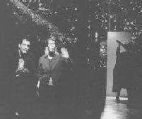 Space ![]() In the meantime, here's the versatile Tina Landau (director, composer-lyricist as well as playwright) with the New York premiere of Space a play commissioned by the Steppenwolf Theater Company. It's the story of Dr. Allan Saunders (Tom Irwin), a celebrated university neuropsychiatrist who's modelled after a Harvard professor named John E. Mack. Its not very dramatic arc follows the collapse of Saunders' egocentric and self-assured universe when he starts to believe that there's something to the claims of alien abduction by three very different but normal looking patients. Like her last work to be seen in New York, the musical Dream True, this is a beautiful to look at production. Projectionist Jan Hartley and lighting designer Scott Zielinski, who greatly enhanced that flawed but fascinating enterprise, once again bring the stage alive with their wizardry. Against James Schuette's elegant set, these talented technicians transform Martinson Hall, an architectural treasure in its own right, into a brilliant universe of stars, planets and galaxies. Unfortunately, while the visual aspects of Space are stunningly realized, the script is not. The staging and all the sentiments voiced about whether science is "acquisition of knowledge and power" (about which Saunders has written a book) or "the acquisition of humility" create an aura of profundity which, like the emperor's clothes, prove to be more platitudinous than profound. The stop and smell the roses message is to stop and look at the stars so you can "listen deeply. " There's nothing wrong with this theme, except that the issues raised are awash in a flood of talk. There's nothing wrong either with using a romance to put big questions about the cosmos into human perspective; that is, if the relationship develops convincingly as that between Dr. Saunders and Dr. Bernadette Jump Cannon, (Amy Morton) does not. Their tête-à-têtes are debates peppered with references to famous writers, scientists and philosphers which do little to persuade us that either one could stop thinking long enough to feel. Bernadette at one point uses Galileo, Darwin and Freud to prove that the top of the kowledge chain is ever changing -- the inventor of the telescope went blind, the man who championed man's superiority beause he stood upright became a cripple, and the inventor of "the talking cure"" lost his voice. Interesting as all this is, one can't help wishing both doctors would shut up and act on their sexual feelings. Ms. Landau who has been widely quoted as saying she neither reads science fiction or watches the X-Files or Star Trek, might have benefitted from taking a look at how some of the best sci-fi books and these shows create rounded, memorable characters. The theatricality of Space notwithstanding, most of its characters remain shadowy underdeveloped cardboard cutouts. The exception is Dr. Jim Lacey (played with compelling exasperation by Larry Keith) the department head who tries to keep his "star" from undermining his career and the university's reputation over the three alien abductees. Those abductees should be fascinating and revealing characters -- Taj Mahal (Teagle F. Bougere) a brilliant, all-knowing tough bike courier; Joan Bailey (Krisitine Nielsen), a cheery on the surface wife, mother and administrator at the college; and Devin McFallen (Andersen Gabrych), a young man with a lengthy and troubled psychological history. In fact they might serve better as the center of the drama than the gabby Dr. Saunders. An eighth character identified only as the singer (Theresa McCarthy), floats on and off stage periodically, a sort of space-y bride, who sounds good (as does all of Rob Milburn's & Michael Bodeen's original music) but serves no discernible purpose except to underscore the more pretentious elements of this play. While Ms. Landau's deserves praise for the physical production another director might have pulled the reins on the main character's endless babble. When it finally stops for a genuinely moving two minutes of silent contemplation of the stars, it's too late for us to feel anything but relief. Perhaps Broadway and film producer Jim Stern, who bought screen rights to the script, will edit some of Dr. Saunders' verbal excess and expand on those more interesting but so far underdeveloped alien abductees. In the production now at the Papp, the characters never lose the fuzziness of our reproduction of the press photo. The result is a play that touches us visually but not viscerally. Links to Shows Mentioned Dream True Experiment With an Air Pump Quark Victory Copenhagen Tesla's Letters The Lone Runner