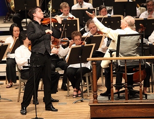 Of course, no 4th of July concert at Tanglewood is complete without Fireworks. This year's display was colorful as ever. A splendid finish to a crowd-pleasing evening. Mother Nature's good mood held for the next day's first program of The Boston Symphony Orchestra's 2013 season at Tanglewood. Annother crowd pleaser, this one an All-Tchaikovsky evning with Joshua Bell giving a stirring rendition of the composer's violin concerto. It's hard to believe that this marked the charismatic Bell's 25th consecutive summer at Tanglewood. Wasn't he a budding prodigy just yesterday? Popular guest conductor Rafael Frühbeck de Burgos was at the helm, following the Bell solo with a rousing Symphony No. 5. Check out Curtainup's Tanglewood Tips Page