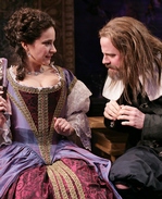 This season, Gus Kaikkonen directs Tartuffe at the Peal Theatre Company with no opposition from the Catholic Church or any religious groups. Yet the play has lost none of its relevancy in modern times. Take away the rhymed couplets and the period dress and set, and you have a thoroughly modern play — a play that is both a farce and an intelligent comment on how foolish people can be fooled by wolves in sheep's clothing. Orgon (TJ Edwards) is a wealthy bourgeois with more money than brains. He finds a "pious" vagabond, named Tartuffe (Bradford Cover), takes him into his household and gives him free reign. In one of the funnier scenes, we see Tartuffe's servant Laurent (Kila Packett) covering up exposed private parts of the people depicted on the wall tapestries. Orgon wants to wed Tartuffe to his lovely daughter, Mariane (Carrie McCrossen), even though she has already been promised to the man she truly loves, Valere (John William Schiffbauer). He is particularly pleased that Tartuffe keeps an eye on his much younger second wife, Elmire (Rachel Botchan). What Orgon doesn't know is that Tartuffe watches Elmire so closely not because he is trying to preserve her virtue but because he is infatuated with her. He declares his unwelcome attraction in a scene of singular salaciousness, while Orgon's son Damis (Sean McNall) hides in the closet. Even after Damis reveals Tartuffe's perfidy, Orgon stands firm. He would rather disinherit his son than believe the worst of this saintly man. Aside from the family, there are two people who see Tartuffe as the con artist he really is, Elmire's brother, Cleante (Dominic Cuskern) and the family's maid, Dorine (Robin Leslie Brown). Cuskern, is excellent as the rasionneur, the voice of the author and a thankless job in a comedy, but one the play cannot do without. And Brown is marvelous in her sarcasm and good sense. It is Dorine who gets between the two young lovers and gets them to end their foolish (and very funny) bickering so they can concoct a plan to foil Tartuffe. And she convinces Elmire to provide the trap for the imposter. Brown might have stolen the show if not for the overall high level of acting throughout the cast. McNall, McCrossen and Schiffbauer all prove that the young can be every bit as silly as their elders. And Botchan has a gift for physical humor that rivals the great Lucille Ball and Carol Burnett. However, it is Cover, whose original interpretation makes this Tartuffe unique. Rather than portray Tartuffe as the personification of evil, a man who cleverly plots against those he wants to fool, Cover's Tartuffe is an opportunistic con man who is often genuinely surprised at his own success. "What's with these people?" he often seems to say. And, quite delightfully, it is often the very ease of his triumphs that makes the play so funny. Pearl is using the excellent and elegant translation of poet Richard Wilbur. Couplets fall from the actors' lips as easily as "Good morning. How's it going?" This makes no small contribution to the pleasure of watching the play. Tartuffe gives modern audiences the wonderful opportunity to step back into the 17th century and get a better look at the 21st.