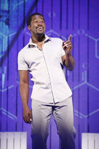 Beaty, who is the script writer as well as performer, begins by embodying a meek-voiced but strong-willed 10-year-old boy named Eric, determined to concoct a magic elixir that will cure the sadness he sees in the eyes of the grown-ups around him. Eric is the voice of innocence and hope that the adult characters have lost. His dad, Mr. Rogers, runs a health food store in the hood, which he wryly equates to "a fried chicken stand in a vegan compound," while Bishop, the local pastor, wrestles with an addiction to Ho Hos and serious over-eating. Other characters we meet include Bishop's son, Isaac, a music executive who stuggles with his sexual identity and mentors young 'Twon, a recent high school graduate from the Jefferson Projects. 'Twon is bound for Morehouse College and a greater future than his own absent father despite the influences that threaten to pull him back into the cycle of too-young parenthood. There's also Mr. Rogers' employee Dre, a nerve-addled former junkie pacing a hospital hallway as he waits for news about his pregnant girlfriend. Rounding out the cast with the wives and girlfriends (and one boyfriend) of these men, Beaty reaches into every corner of one community. Randolph-Wright's directorial nuance and Beaty's precision as a performer prevent us from being distracted by the numerous and rapid character transitions. Except for Alexander V. Nichols' boldly colored projections to indicate locations, Beaty relies on his physicality and vocal intonation to quickly make each of his characters distinct and recognizable. He takes each of one from dialogue to soliloquy to a heightened state of dream-like internal monologue, making this at times feel more like a poetry slam than a play. While I didn't find this device a problem I did find the revelatory moments of the various characters struggles a bit too simplistic. I also would have preferred a bit more subtext, instead of having each character say exactly what he means. It's as if Beaty doesn't trust his audience enough to understand anything not spelled out. On the plus side, the 80 minutes are peppered with easily accessible, universal humor and the moments of music and stylized rhyme make us understand why Beaty and his characters have already had three previous productions: at the Geffen Playhouse in Los Angeles and New Jersey's Crossroads Theater in New Jersey (see Curtainup critic Simon Saltzman's more unqualified rave here ) which also premiered his previous solo show EmergenceSEE (Our Review when it was at the Public Theater). No wonder the Off-Broadway production has opened for an optimistic open-ended run.