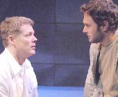 Gray's style is slow and quiet and that's how this story unwinds. He once again relies on the ghostly shadow of a dead man (Darren Lougee as the uncle of the title who died when Brent was a year old) to help the troubled young composer live a less cocooned, emotionally crippled existence. That means Brent must finally unpack and air out the issue of his homosexuality with the mother who nurtured his talent and yearns to see more of him but on her territory. She hasn't visited him in the ten years he's lived in New York. Andrew Rindfleisch's hauntingly beautiful choral music establishes the play as a redemptive journey which makes Brent realize that he is not doomed to relive the tragedy of his uncle's life but can instead use it to guide him towards an epiphany for himself and his mother. Much more than just incidental music, Rindfleisch's recording (which is sold in the lobby) is especially meaningful since the Uncle whose presence overarches the flashbacks and memories interspersed with the present day scenes was a member of a successful choral singing group. It's a snapshort of Uncle Irvin with another young man that he sees in his mother's family photo collection that triggers Brent's need to find out more about this uncle he never knew but who he senses might have helped him deal with the pain of being an outsider in a homophobic family. The first step in the puzzle hinted at in that snapshot is to track down a record by the choral organization with which Uncle Irvin performed. That search serendipidously brings Sean (James Heatherly), a reference librarian into the picture. The successful search for the record in turn leads to Anthony (Richard Bowden), Irvin's very much alive former accompanyist and now manager of the choral group which just happens to be booked for a New York concert. The back and forth shifts between past and present are easy to follow, with Nancy McDonniel smoothly switching from Irvin's sister to Brent's mother and James Heatherly from Sean to Anthony as a young man. The connection between Brent and the Uncle he wished had been there when he was growing up is forged with few surprises, but the predictability of the script and the over-leisurely pace of Wayne Maugans' direction are offset by Brian Patacca's sensitive portrayal of Brent and James Heatherly's as Sean. Heatherly's vibrant charm is a perfect counterpoint to Patacca's sad-eyed and conflicted character. The three supporting actors are fine but this is Patacca and Heatherly who hold our attention and engage us emotionally. This is obviously not a big budget production so there's not much to say about the staging except that the designers manage to make very little go far to suggest time and place. At a movie-priced ticket cost in a small theater that doesn't have a single bad seat, Uncle is worth checking out. LINKS Farm Boys, also by Dean Gray Lee Blessing's Thief River, my own favorite play on this theme