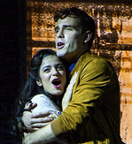 Chain link fences against anonymous public housing by set designer Kristen Robinson lit by David Lander's whimsical windows opens the show with the intimidating gang swagger in the Jets Song. Against this backdrop of the gritty 1950's New York's west side, now Lincoln Center, the doomed lovers, third generation American Tony (Will Branner) and newly arrived Puerto Rican Maria (Addie Morales,) experience a tectonic upheaval when they meet at a neighborhood dance. It's an updated version of Romeo and Juliet for the uninitiated, and the fallout rocks their world for a glorious two hours and twenty minutes of enduring music and captivating dance — and why not? Leonard Bernstein's music, Jerome Robbins' choreography and Stephen Sondheim's lyrics have not lost the luster of their combined genius. Julianne Boyd, Barrington's Artistic Director, along with Robert LaFosse's staging of Robbins'original choreography and Darren R. Cohen's musical direction, transports the rapt audience back in time when racial antipathy ruled the grittier streets of New York's street gangs in their clearly demarcated "turf wars." However, present day immigrant struggles shimmer behind every expressed cruelty and insult exchanged by not only the gang members, but the police force's Lieutenant Schrank (Douglas Rees) and Sergeant Krupke (Christopher Tucci) who are sworn to protect all equally. Add a little rap music, lose the antiquated slang and move to another neighborhood; nothing much has changed. The set, costumes, lighting that support the multi-talented singers and dancers unifies the piece into a memorable celebration of the American Broadway musical. The cast of twenty-seven fills the stage to bursting with youthful physicality and commanding vocal registers. The collection of talent is simply staggering in this visual and aural feast. Addie Morales's Maria is sheer perfection as the innocent young woman struck by lightning at the first sight of the forbidden Tony. Sheltered by over-protective parents and, Sharks' leader, brother Bernardo, she is ripe for a fairy tale lover. Morales simple body language and Madonna-like face telegraphs every finely nuanced emotion available in the human repertoire. When she sings it is as if the notes float effortlessly from her lips. Will Branner's Tony is appropriately handsome, virile and complicated. His tender duets with Maria are a sharp contrast to his vengeful action at the rumble. Branner has mined the testosterone imbalance of teenage love and hate. His clear enunciation and ringing tenor sell each lyric's intent. Something's Coming sets up his aspirations and Tonight is the couple's brief exaltation of that "Something." Their voices do not always mesh, but neither do their backgrounds, so perhaps that is an innovative interpretation. Though it's Tony and Maria's story, it's Skyler Volpe as Anita who makes the production pop. Volpe is a sex engine who drives the subplot of her steamy relationship with Bernardo. She can only be described with a thesaurus's supply of synonyms such as exotic, erotic, and heart-palpitatingly seductive. Her every eyebrow movement could dominate a stage and it does! Anita and her girls deliver a riveting America. Her "Tonight Quintet, A Boy Like That/I Have A Love" are inspired. Bernardo (Sean Ewing) is her counterweight with his darkly controlled menace as the Sharks "El jefe," pitted against the arrogant red-headed punk Riff (Tyler Hanes,) the Jets' bully boy. Hannah Balagot's Anybodys is a wannabe who shines as the Jet misfit hanger-on; her antics provide comic relief, but also sympathy for the misguided attempts to belong, which is really the theme of the play itself. Who belongs? Who has the right to be part of a gang, New York, America? The rival gangs of dancing bad boys and their female counterparts deliver performances to compete with any Broadway show. A glance at their bios reveals an extensive list of professional credits. Each cast member has been carefully chosen to create a cohesive wall of talent that washes over the stage to carry this classic to a new level: "The Dance at the Gym" is a thrilling swirl of life; The often cut "Dream Ballet" id s revelation with everyone, even Tony and Maria, dancing. Sara Jean Tosetti's costumes are sumptuous layers of Mambo chic which contrast clearly with Maria's delicate symbolic finery. All the characters are dressed in precise representations of the time period. This is a West Side Story made even more relevant by our present global mass immigration and its subsequent cultural upheaval. Congratulations to Julie Boyd and the entire ensemble for this seamless sensual vision. Editor's Note: We've seen and reviewed numerous productions of this iconic musical, including one at Barrington StageThis latest and very timely production once again proves that this is one of those shows worth mounting again and again. Curtainup, has caught quite a few of them, including one also directed by Julianne Boyd at Barrington. To read that review which includes a complete song list go here. |